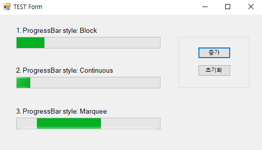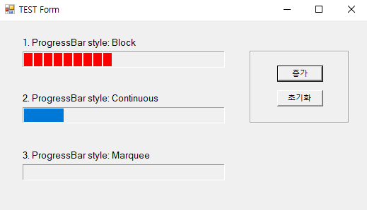 Program.cs 에서 Application.EnableVisualStyles( ) 함수를 사용할 경우 Block 및 continuous 스타일은 둘 다 연속적인 형태로 표현되지만, 해당 함수를 사용하지 않을 경우 아래 결과창과 같이 스타일이 구분되어 지고,Marguee 스타일은 지원하지 않습니다. 또한 색상을 변경할 수 있게 됩니다. (ForeColor 로 색상 변경하기)