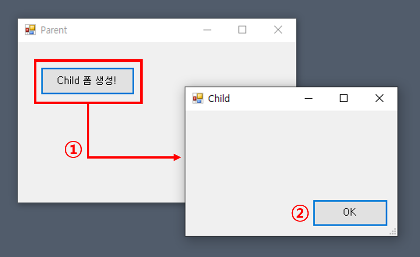 ②: OK 버튼 클릭 시 자식폼이 닫힌 후 DialogResult.OK 값을 리턴합니다.
