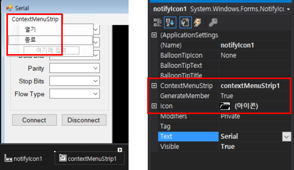 (notifyicon 에서 contextmenustrip 컨트롤을 꼭 등록해 주셔야 합니다.)