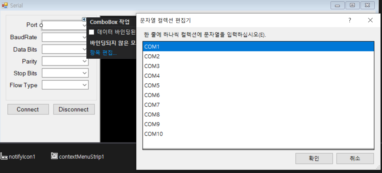 첫번째는 컨트롤 클릭 → 화살표 그림 안 항목 편집 → 문자열 컬렉션 편집기를 사용하여 문자열을 한 줄씩 넣는 방법이 있습니다.