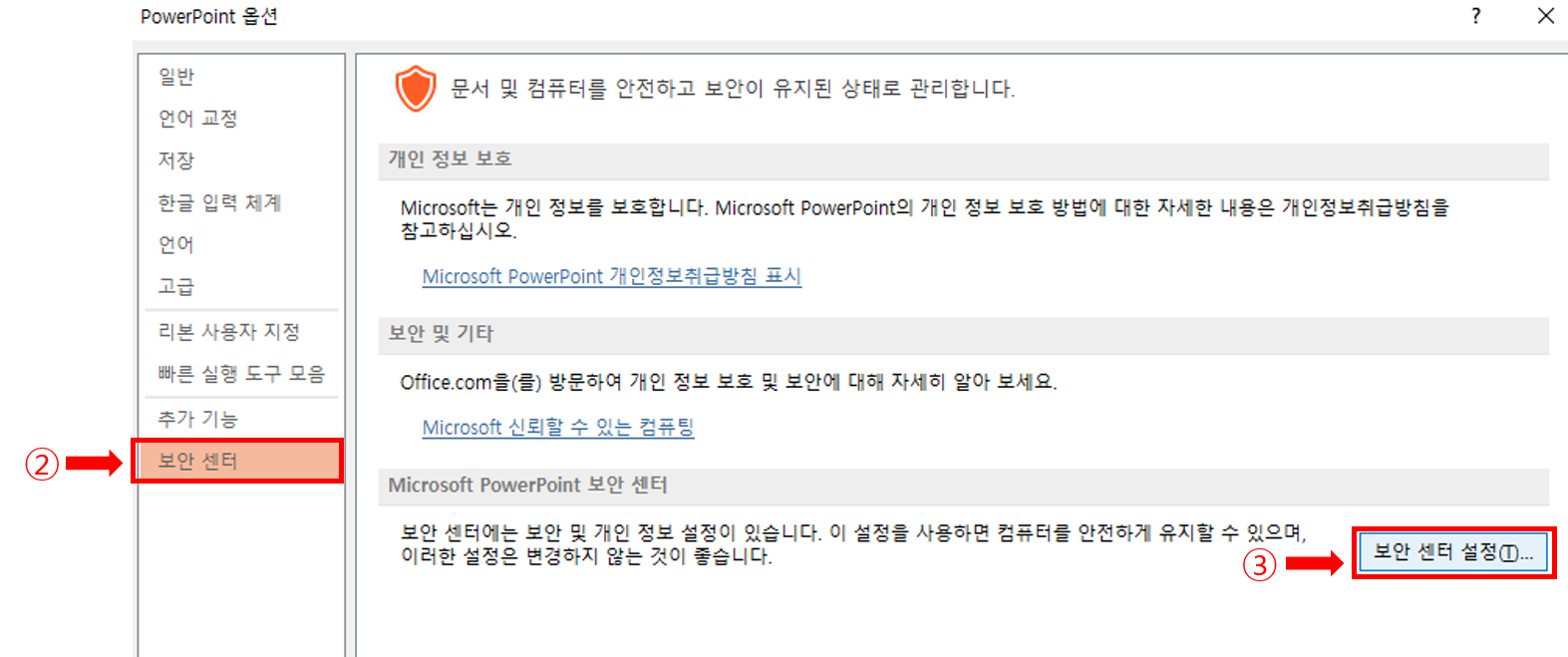 2. [보안센터] → [보안센터 설정] 을 선택합니다.