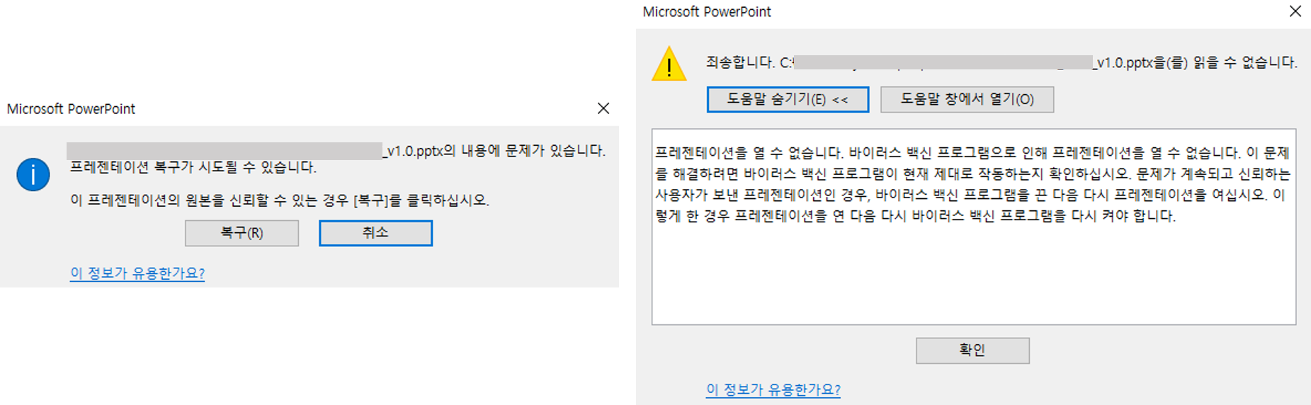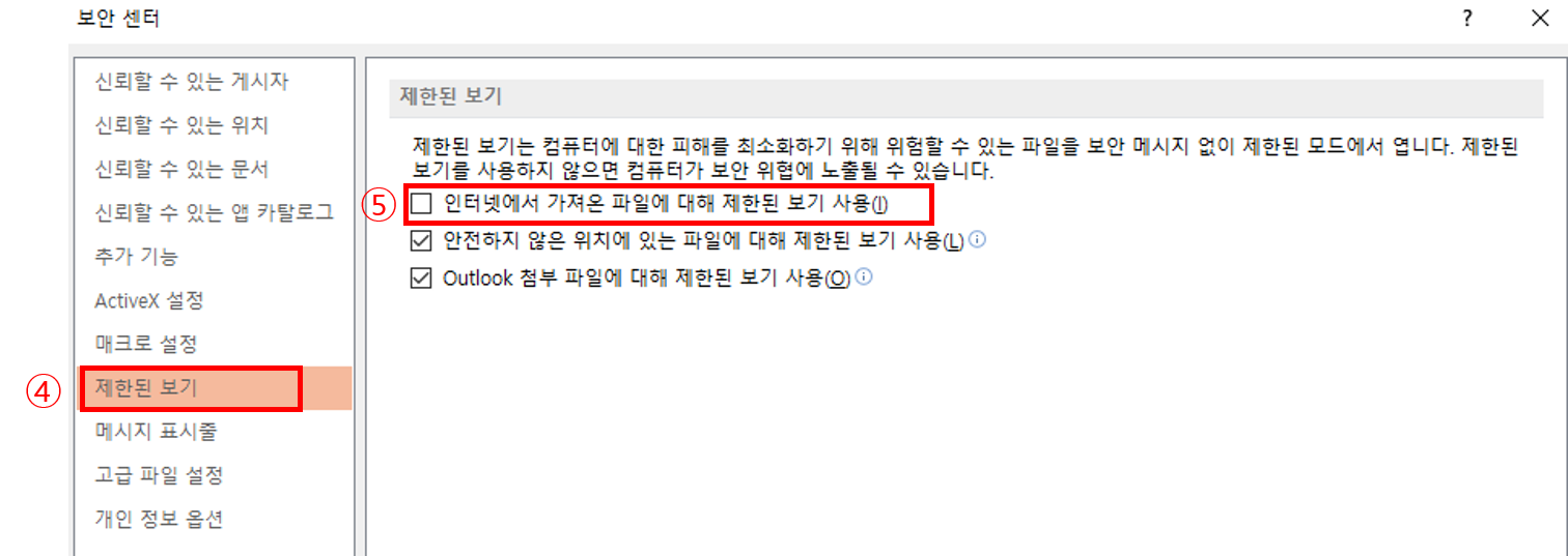 해당 문제는 메일로 온 문서를 다운로드 후 파일을 열었을 때 발생하였고 아래와 같이 설정을 변경하여 해결하였습니다.