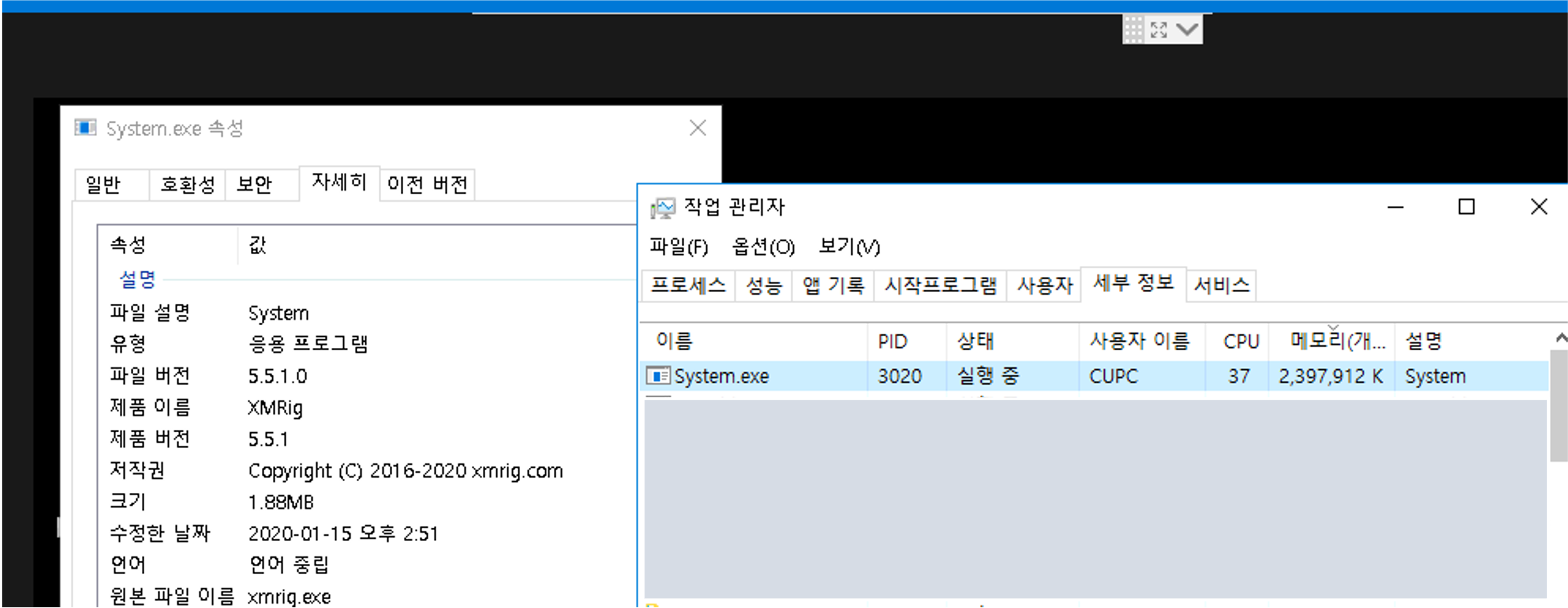 시스템 파일인 척 하고 있는 이 아이의 속성을 보니 원본 파일 이름이 xmrig.exe 로 표시되어 있었습니다.