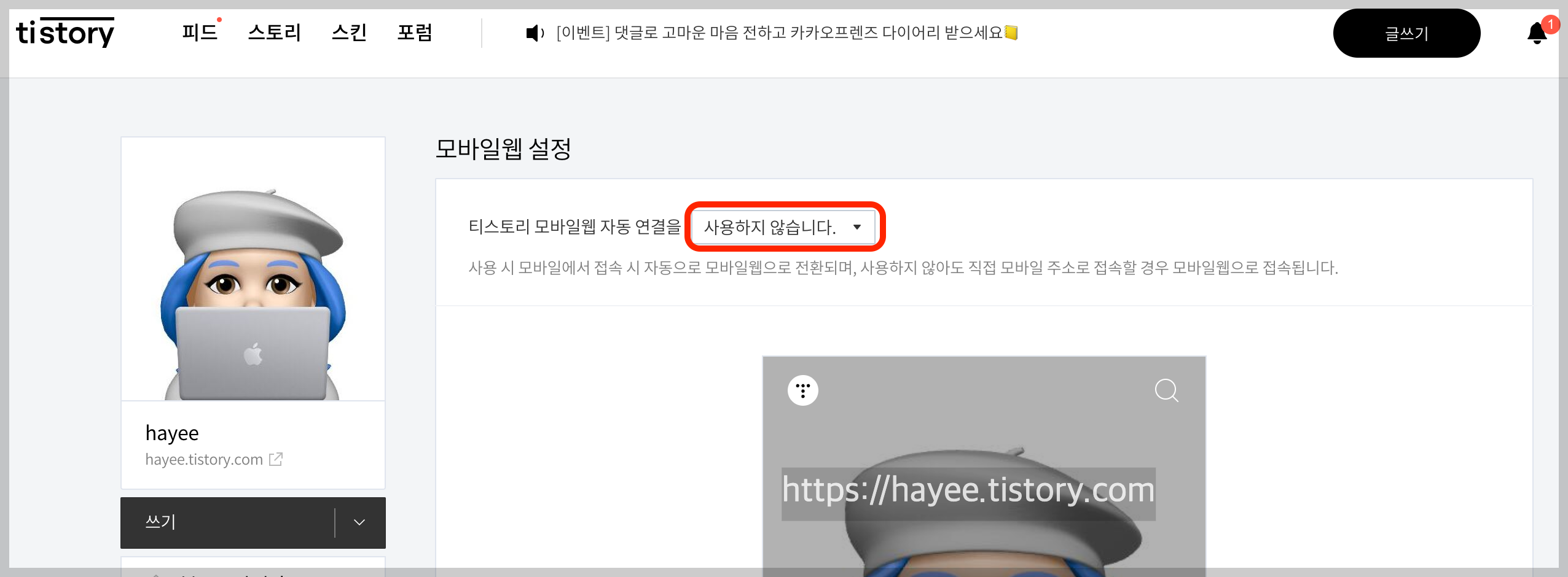 → 티스토리에서 [꾸미기] → [모바일] → '모바일웹 자동연결을 사용하지 않습니다' 로 설정.