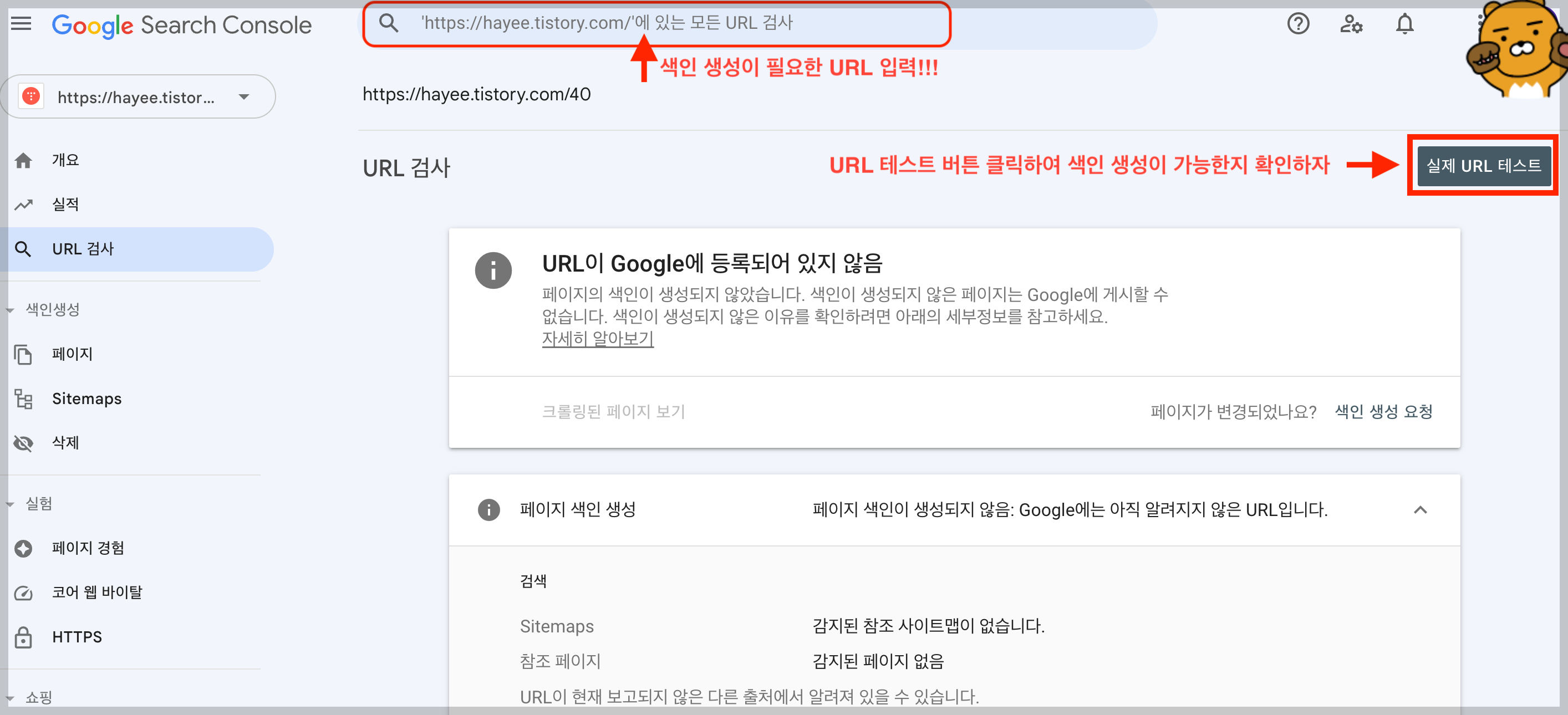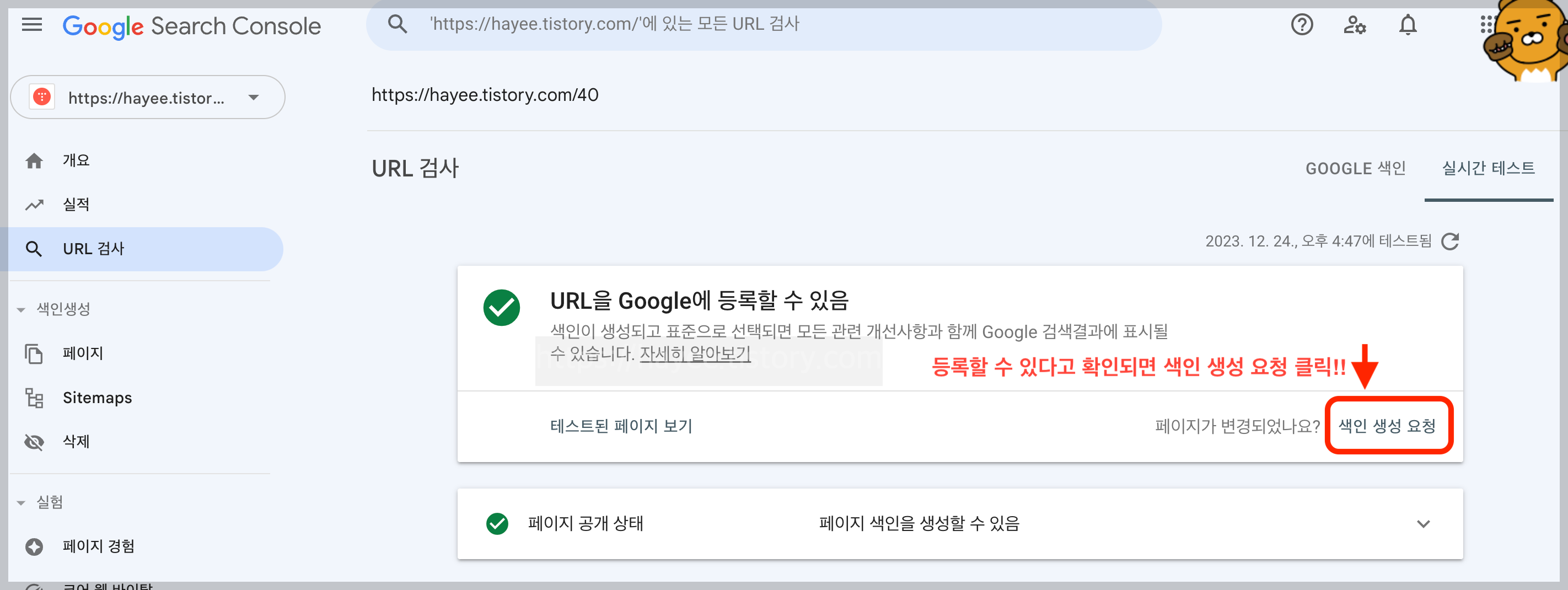 → 구글서치콘솔에서 색인 생성이 필요한 URL 을 입력후 URL 테스트 버튼을 클릭하자.