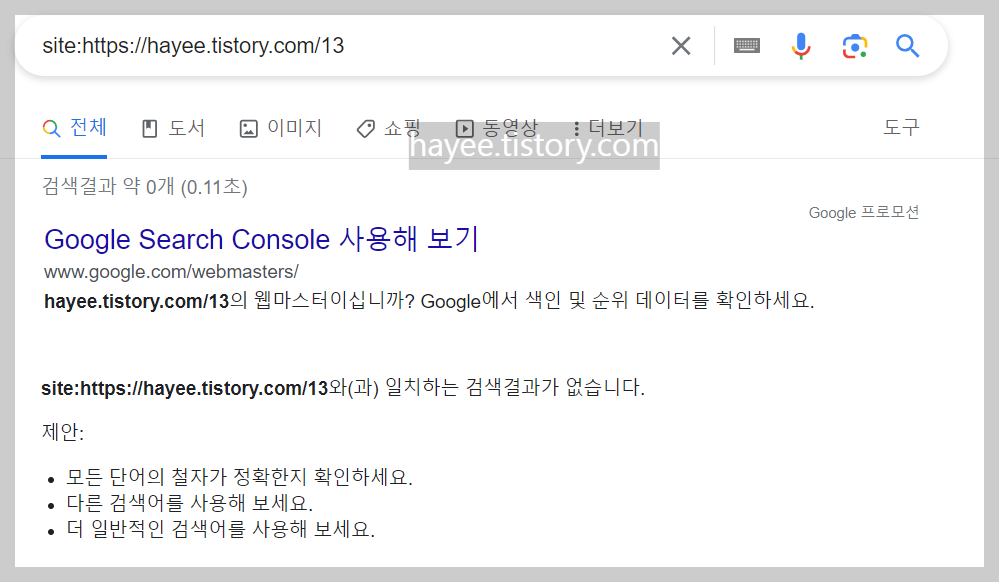 → 구글 검색창에 site:https://내블로그주소 를 검색했을 때 아래와 같이 나오면 구글이 나의 글을 못찾는 것이다