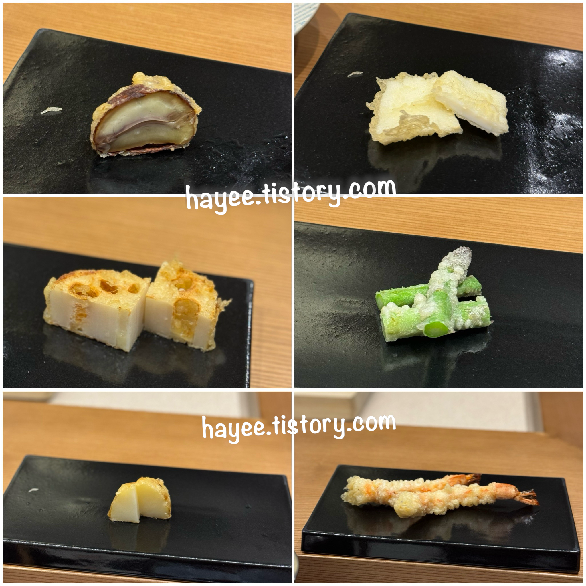 위에 순서대로 밤, 붕장어/삼치, 연근, 아스파라거스, 감자, 새우튀김이다. 표고버섯과 새우가 섞인 덴푸라도 있는데 맛있게 먹느라 찍지 못했다. 😂😂 튀긴 밤은 처음먹어보는데 적당히 달달하니 맛있게 먹었다.