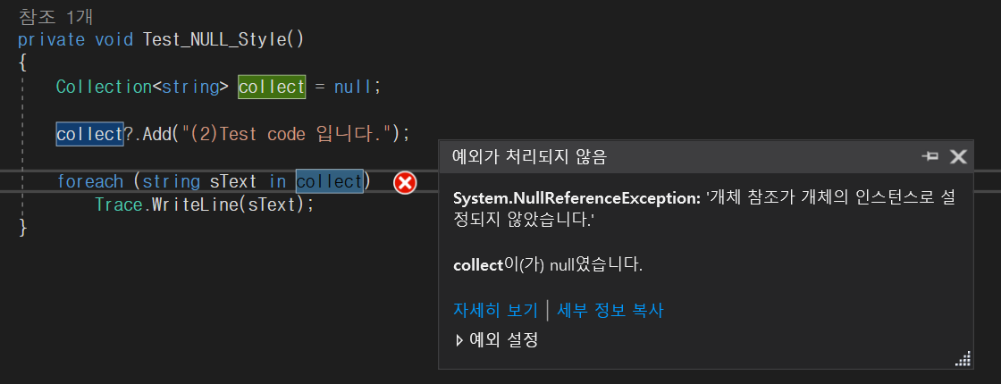 - 위 예제를 실행 할 경우 컬렉션을 생성하지 않아 문자열을 Add 할 수 없으며, collection 이 null 이기 때문에 에러가 발생한다.